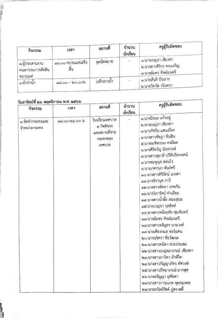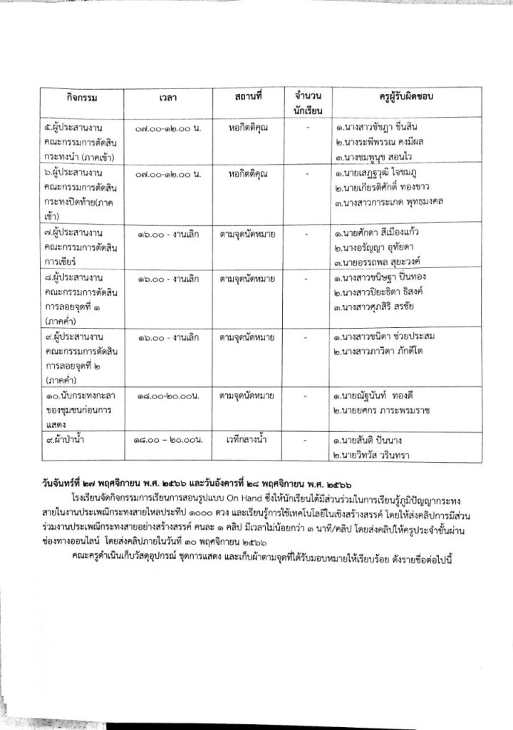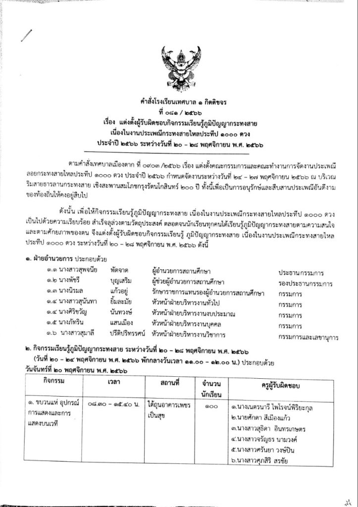 ตามคำสั่งเทศบาลเมืองตาก ที่ 030/2566 เรื่อง แต่งตั้งคณะกรรมการและคณะทำงานการจัดงานประเพณีลอยกระทงสายไหลประทีป 1000 ดวง ประจำปี 2566 กำหนดจัดการแสดงวันที่ 20 - 25 พฤศจิกายน 2566 ณ บริเวณริมสายธาราลานกระทงสาย เชิงสะพานแขวนโค้งรุ้งด้านในฝั่ง 600 เมตร ทั้งนี้เพื่อเป็นการอนุรักษ์และสืบสานประเพณีดังกล่าว จึงขอแต่งตั้งให้คณะผู้รับผิดชอบปฏิบัติตามหน้าที่ดังนี้